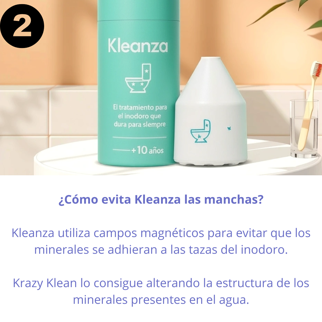 Kleanza previene las manchas de agua, las incrustaciones y el óxido. Altera la estructura de los minerales del agua utilizando campos magnéticos.